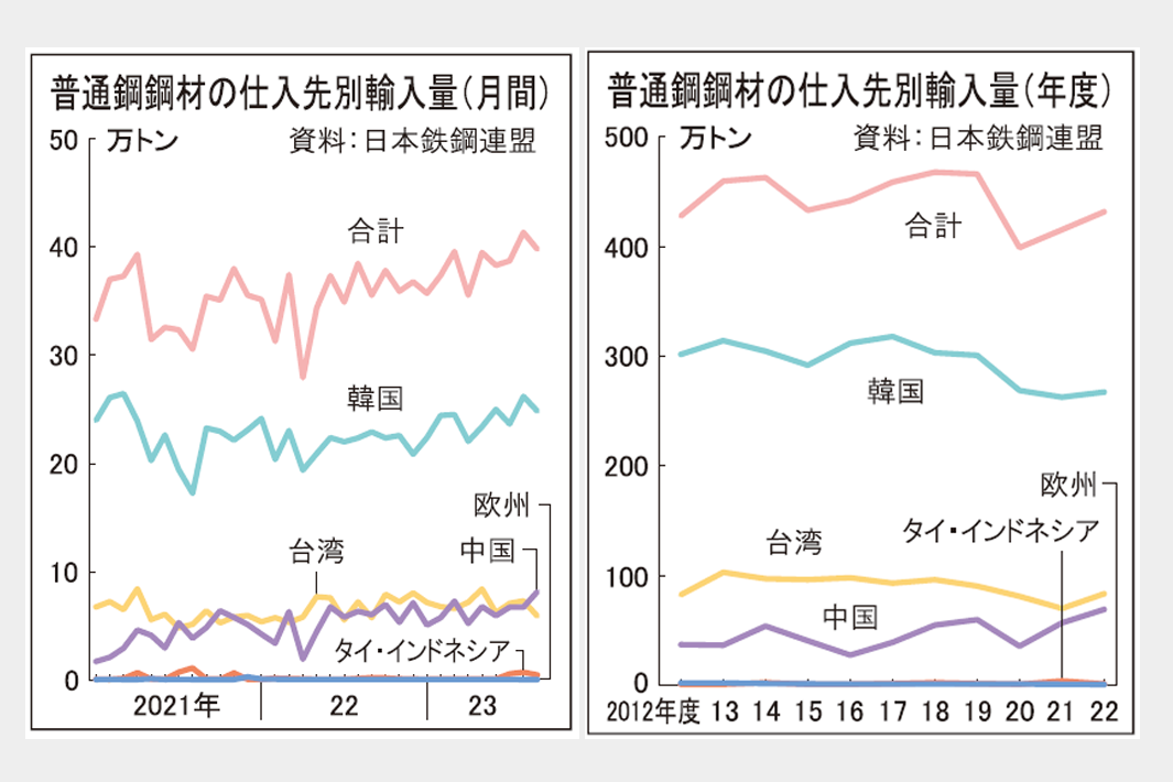 普通鋼鋼材の輸入量が足元まで1年半の間、増え続けている。海外市場が新型コロナ禍を受けて以降長く低迷し、とりわけ中国が鋼材輸出を増やしている。為替の円安の中でも価格競争力を保ち、熱延コイルや亜鉛めっき鋼板の輸入が増加。普通鋼鋼材の需要に占める輸入材の比率は10%弱と比較的低位で安定しているが品種によっては需要不振の中で安価な輸入が増え、市場価格に影響しかねない。中国が鉄鋼減産を進め輸出が減る予測も聞かれるが中国の不安定な経済によって日本の輸入増が続く可能性がある。