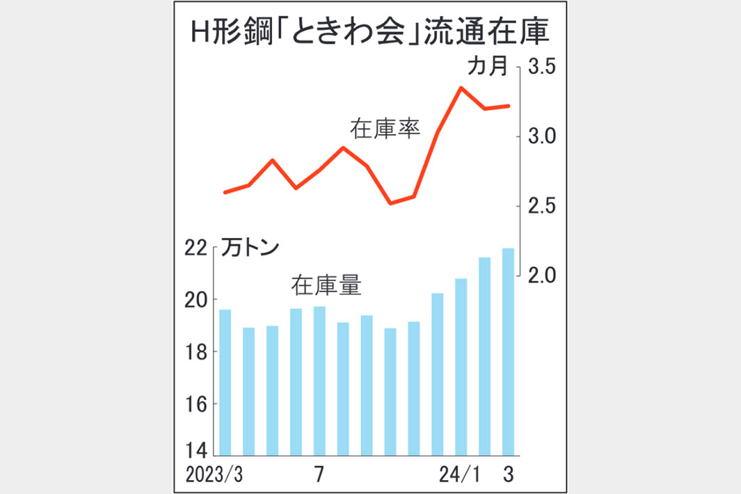 日本製鉄は24日、形鋼扱い流通で構成する「ときわ会」のH形鋼の3月末在庫量が前月比1・6%増の21万9500トンと発表した。5カ月連続で増え、在庫率は0・02カ月増の3・22カ月と微増。出庫量は6万8100トンと同0・8%増加した。日当たり(20日前提)の出庫量は3400トンと同5・6%減(マイナス200トン)だった。同社では増加した在庫量について「適正水準の範囲内と想定するも、今後の動向は要注視する」としている。