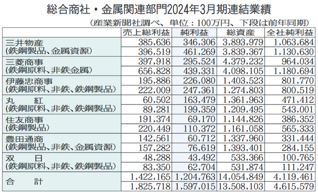 総合商社7社の2024年3月期連結決算が8日出そろったが、金属関連事業は原料炭価格や北米など海外鋼材市況が下落した影響などで全7社の純利益が前期比で減少した。今期は資源・鉄鋼製品ともに事業環境改善に時間がかかるとみられる中、伊藤忠商事、住友商事の2社が増益を計画する。