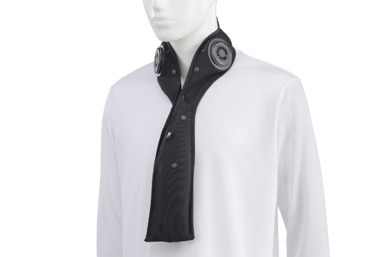 「アイスタッチデバイスネック」には、電流を流すと冷却するペルチェデバイスを首の両サイドと後ろの3カ所に搭載している。ペルチェデバイスは、強・中・弱の3段階冷却モード切り替えが可能で、強モードで稼働する場合、環境温度30度、湿度60%の状態で稼働前と比較すると、1分後に冷却面の低下温度は約14・3度になるとしている。本体の生地には肌面には高通気、接触冷感のドライエアロフローアイス採用し、ペルチェデバイスやバッテリーを取り外すことで洗濯が可能。夏に問題になる衣服の衛生面にも対応する。