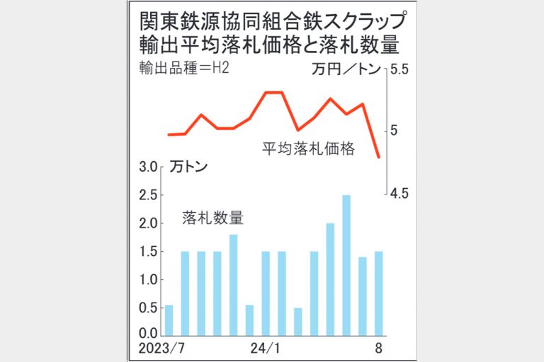 関東の鉄スクラップ加工業者で構成する関東鉄源協同組合(理事長=南光司・ミナミ社長)が9日に実施した8月契約分(9月積み)の鉄スクラップ輸出入札の落札価格は、トン当たり4万7956円(H2、FAS=船側渡し)と、7月実施の前回から4212円(8%)下がり、1年ぶりに5万円を下回った。為替のドル安・円高が円建ての輸出価格を引き下げた。米国の景気後退懸念も下げ材料となった。足元の関東相場の高値圏とおおむね同水準のため、市況への影響は限定的とみられる。