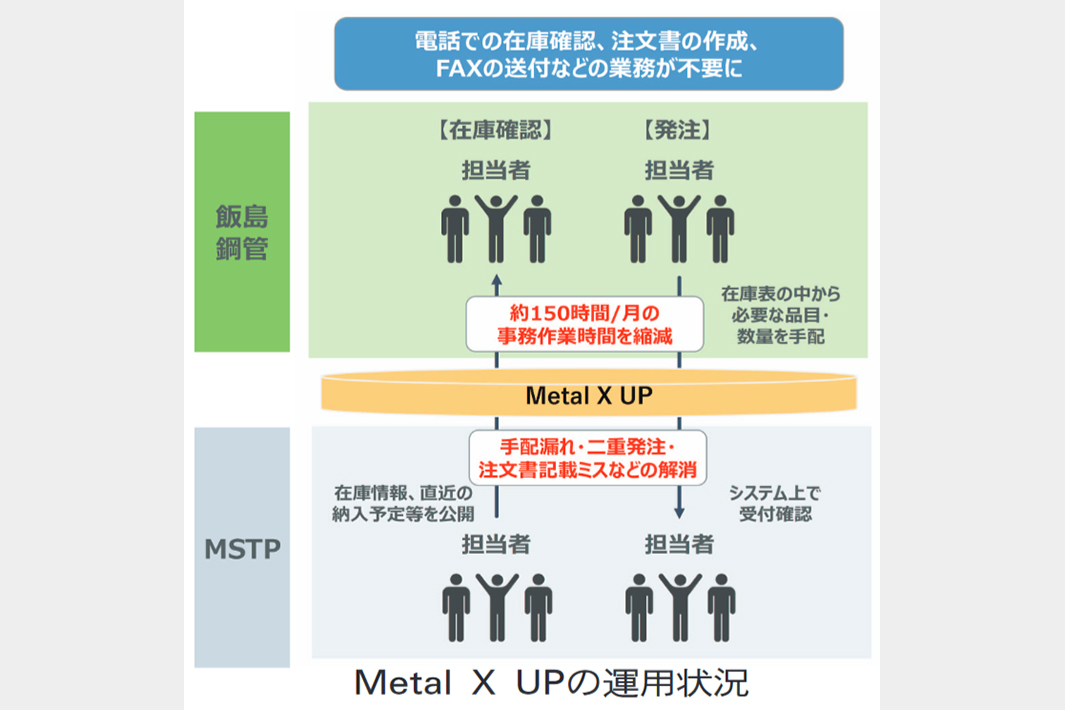 メタルワン、住商メタルワン鋼管(MSTP)、飯島鋼管の3社は、鋼管流通特有の煩雑な商習慣を改善するべく業務効率化、高度化、コミュニケーションコスト削減を実現するデジタル・プラットフォーム「Metal X UP(メタルエックスユーピー)」を構築し、4月から本格展開をスタートした。電話での在庫確認、注文書作成、ファクス送付の業務が不要となる上、手配漏れ、二重発注、注文書記載ミスなども解消され、飯島鋼管では月間約150時間の事務作業時間を縮減できている。
