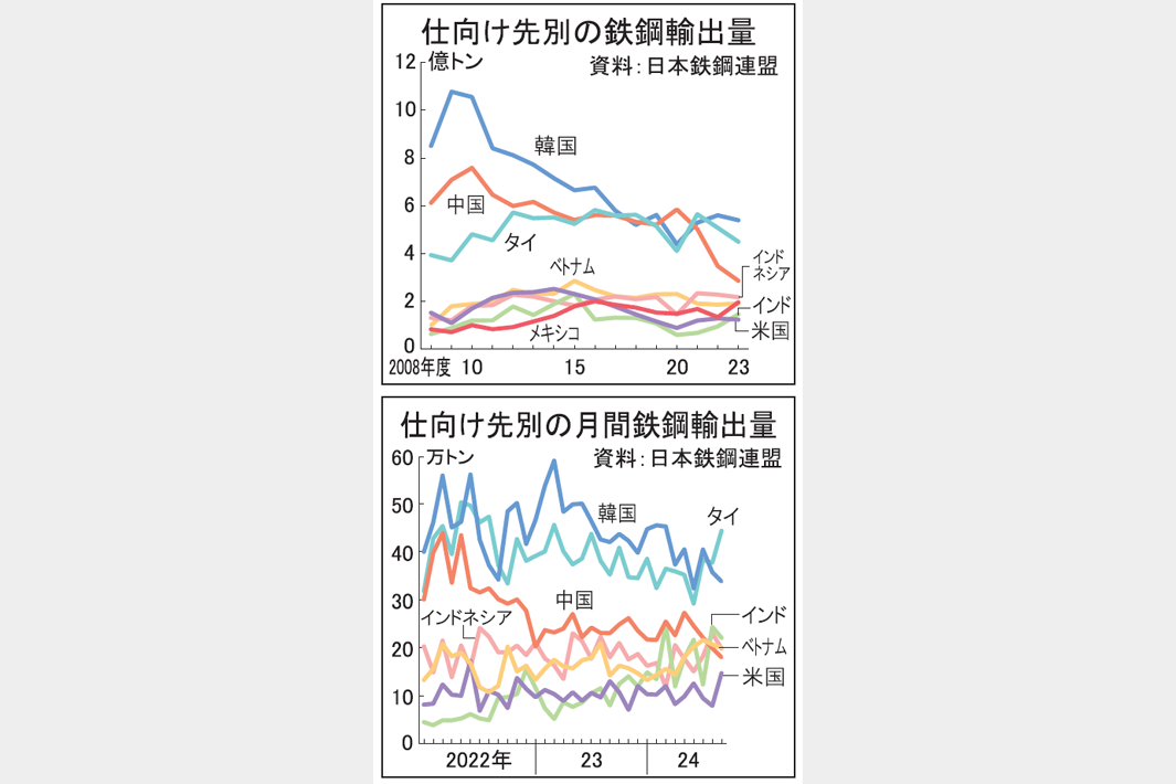 本年度の鉄鋼輸出量は年率3000万トン強と新型コロナ禍に直面した2020年度(3116万トン)を下回り、00年度以来の低水準で推移している。中国の大量の鋼材輸出で貿易環境が悪化し、4―9月期は1606万トンと前年同期比4・1%減。うち普通鋼鋼材は5・5%減の1105万トンで年率約2100万トンと19年度から1割、10年前に比べ2割強減っている。海外の日系需要家や鉄鋼企業の事業会社の業況も芳しくなく、高炉各社は低調な内需への対応も含め当面、減産の継続を余儀なくされそうだ。