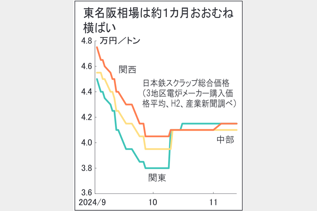 国内の鉄スクラップ市況は模様眺めが約1カ月間続いている。ドル高・円安が円建ての輸出価格を引き上げて国内相場の強気材料となる一方で、国内外の鋼材需要は低空飛行のため原料となる鉄スクラップの調達意欲が盛り上がらない。当紙調べの日本鉄スクラップ総合価格(東名阪3地区電炉メーカー購入価格平均、H2)は13日時点でトン当たり4万1300円と、10月9―11日にかけて1700円上昇してから約1カ月かけてわずか300円高と、ほぼ横ばいだった。目先の相場も方向感を探る展開が続きそうだ。