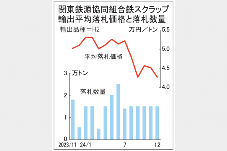 関東の鉄スクラップ加工業者で構成する関東鉄源協同組合(理事長=南光司・ミナミ社長)が11日に実施した12月契約分(2025年1月積み)の鉄スクラップ輸出入札の落札価格は、トン当たり4万2739円(H2、FAS=船側渡し)と11月実施の前回から2441円(5%)下がった。向け先のアジア諸国の鉄スクラップ需要低迷などが下落につながった。関東の船積み業者の買値とおおむね同水準の価格を付けたため、市況への影響は小さいとみられる。