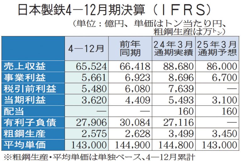 日本製鉄は6日、2024年4―12月期の連結事業利益が5661億円だったと発表した。前年同期の累計実績からは1262億円(18・2%)減。うち在庫評価差などを差し引いた実力ベースの事業利益は6084億円と同1196億円(16・4%)減った。25年3月期見通しは変更せず、事業利益6700億円、実力ベース益7800億円の予想は据え置いた。鉄鋼需要の低迷は想定を超えて深刻化。国内外の実需およびスプレッドの改善が見込めない中、財務体質の改善を進めながら海外事業の深化・拡充に注力し、国内製鉄事業の強化・再構築に取り組む。