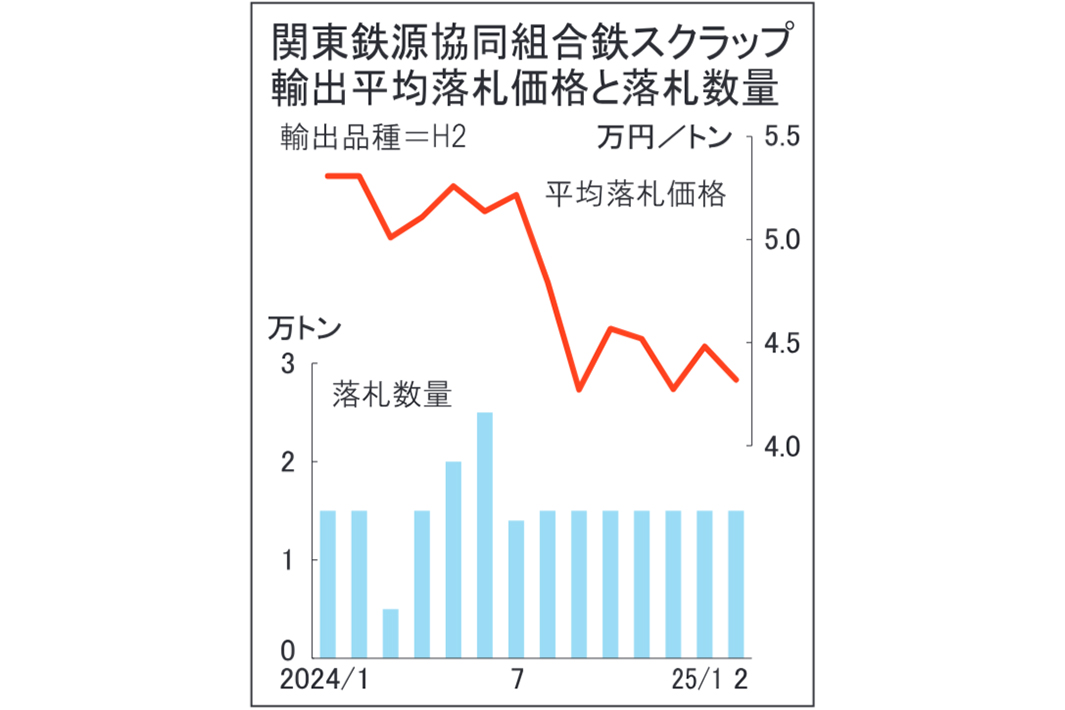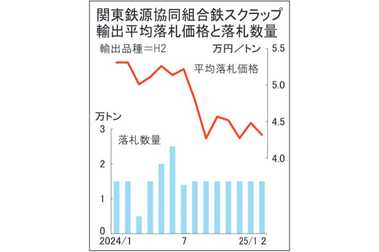 関東の鉄スクラップ加工業者で構成する関東鉄源協同組合(理事長=南光司・ミナミ社長)が12日に実施した2月契約分(3月積み)の鉄スクラップ輸出入札の落札価格は、トン当たり4万3200円(H2、FAS=船側渡し)と1月実施の前回から1610円(3・6%)下がった。為替のドル安・円高が影響して前回から下落した。東南アジアの堅調な鉄スクラップ需要が響いて当日の国内相場を3000円ほど超える高値が付いたが、国内鋼材需要の停滞が続いているため、鉄スクラップ相場の強気材料になる公算は小さい。