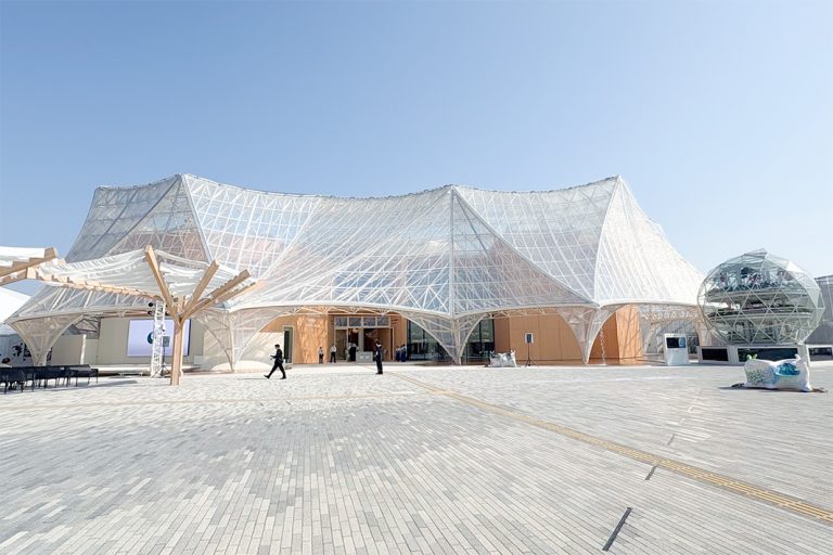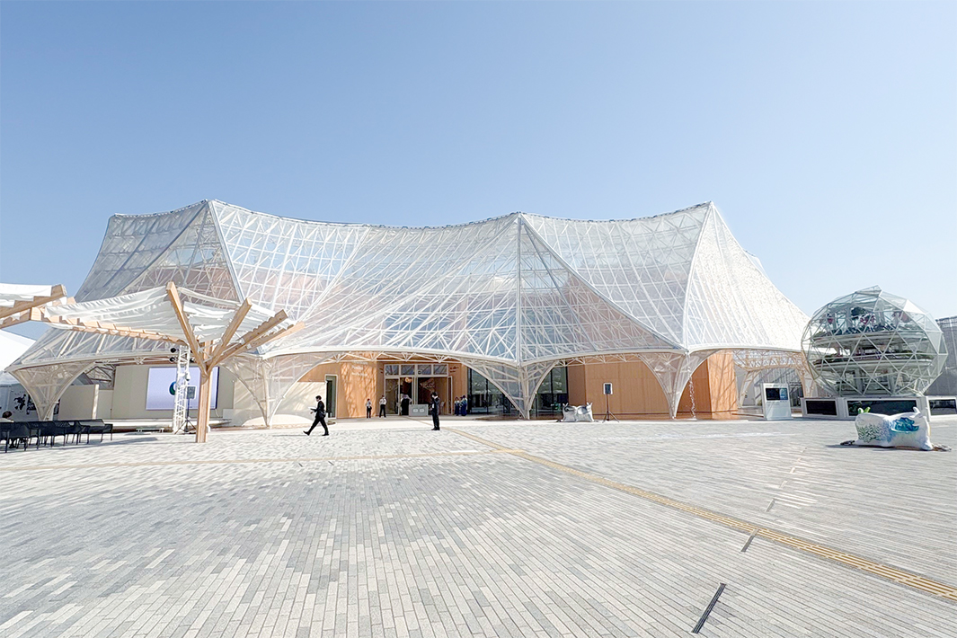 大阪ヘルスケアパビリオンは、敷地面積が全パビリオンの中で2番目に大きい。1万本もの鋼管をつないで透明膜を張った屋根からは水が流れ、太陽光が差し込む。メイン展示となる「リボーン体験ルート」では、現在の健康データを基に25年後の自分(アバター)と出会い、未来の都市生活を体験できる。
