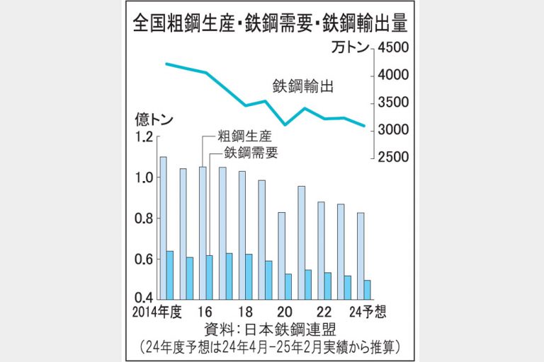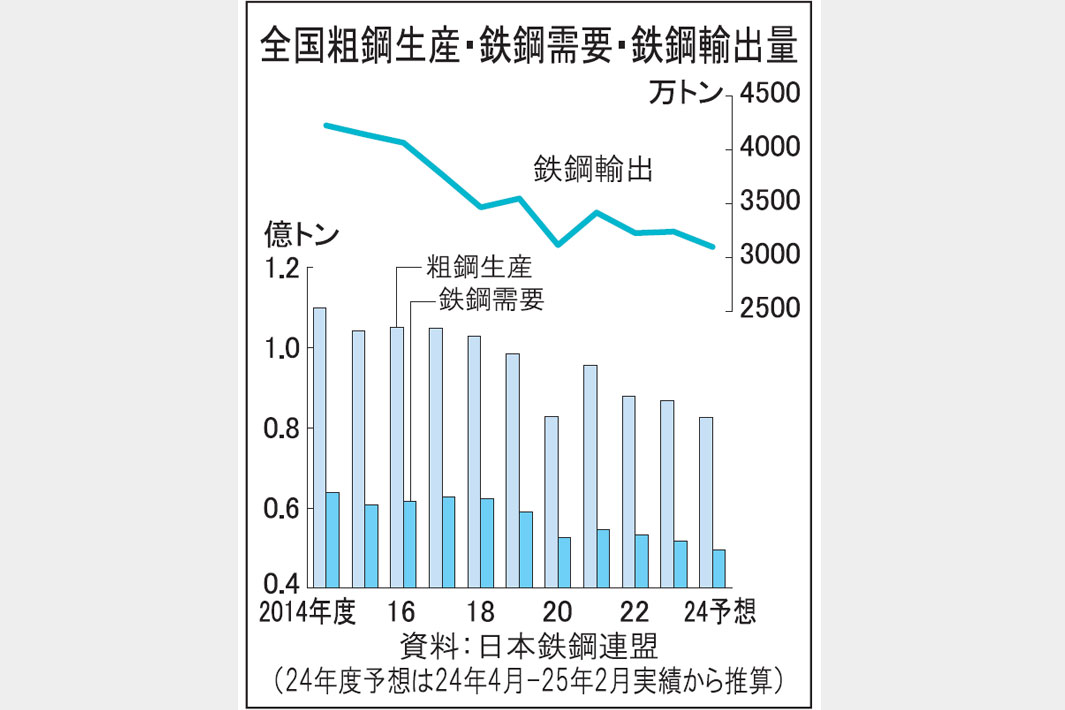 鉄鋼需要が一段減速する懸念が高まっている。人手不足など構造的な事情から建設需要の低迷と中国経済の停滞を主因とする産業機械など輸出産業の不振が長引く。中国が輸出する大量の鋼材が国際市場にあふれ、日本の鋼材輸出がさらに減りかねない中、米国の鉄鋼・自動車関税引き上げに続く「相互関税」による負の作用が国内外の需要に広く及ぶ可能性がある。JFEスチールが高炉1基の一時休止を決めるなど鉄鋼業は減産対応の強化を迫られ、本年度の全国粗鋼生産は新型コロナ禍に直面した2020年度とほぼ同水準の24年度を大きく下回る恐れがある。関連記事2、14面