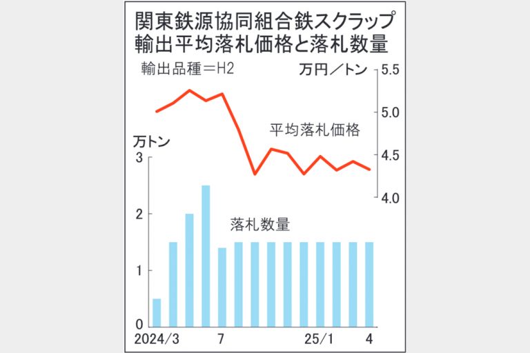 関東鉄源協同組合(理事長=南光司・ミナミ社長)が9日に実施した4月契約分(5月積み)の鉄スクラップ輸出入札の落札価格は、トン当たり4万3288円(H2、FAS=船側渡し条件)と3月実施の前回から938円(2・2%)下がった。下落は2カ月ぶり。為替のドル安・円高傾向が円建て輸出価格を押し下げたが、ドル建て価格(TTB換算)は299・82ドルで前回とほぼ同水準だった。足元の国内市況への影響は軽微とみられる。