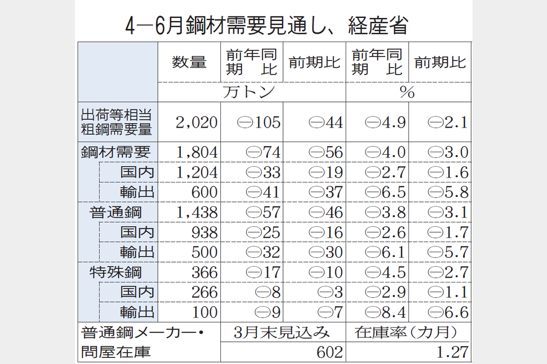 経済産業省が10日まとめた2025年度第1四半期(4―6月)の鋼材需要見通しによると、出荷等相当粗鋼需要量は2020万トンと前期実績見込み比2・1%減る。2四半期連続の減少。鋼材需要は内外需ともに減少する見通し。前年同期比でも内外需とも減る。鉄鋼の数量割当、適用除外が撤廃された米国の関税は、自動車のほか幅広い領域に広がっており、中国ほかの報復などの影響も需要動向に影響する可能性がある。
