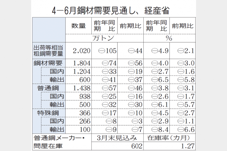 経産省 粗鋼需要2020万トンに減 4―6月見通し