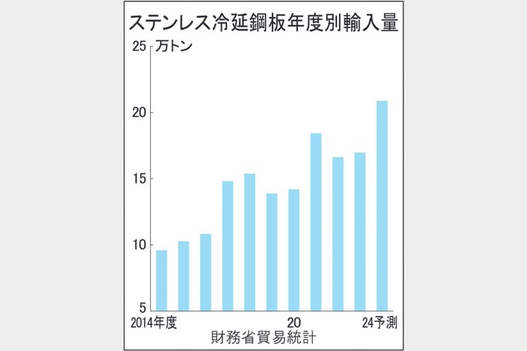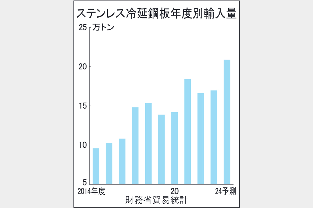 ステンレス冷延鋼板の2024年度の輸入量は、過去最多となりそうだ。財務省が公表した貿易統計によると、24年4月から25年2月の入着量は、前年同期比23・1%増の19万1502トンと、すでに前年度を上回って過去最多ペースの入着量が続いている。3月の輸入量が1万トン前後以上だった場合、過去最多の20万トンに達するとみられる。需要がさえない中で、輸入材は安価なことや近年の品質向上などもあって市中に浸透。輸入先も中国や台湾、インドネシアへと広がり、扱い筋も増えている。