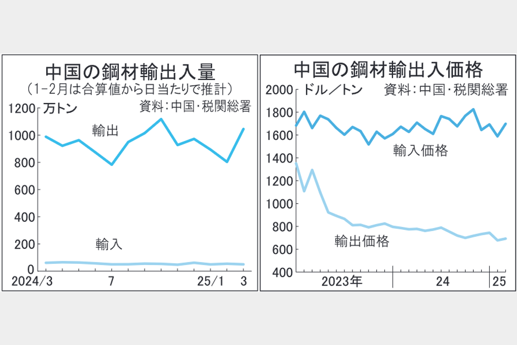中国の鋼材輸出量は1―3月合計2742万9000トンと前年同期比6・3%増加した。年率1億1800万トンと過去最高ペース。建設分野など需要が低調な中で鉄鋼メーカーは粗鋼生産を高く保とうと輸出を継続。米国の関税引き上げ前の駆け込みも含まれた可能性があり、3月は1045万6000トンと5カ月ぶりに1000万トンを超えた。鉄鋼減産が進まず、輸出は高水準を維持するとみられるが、米国の関税政策の影響によって需要が国内外で下振れし、国際的に鉄鋼需給がさらに緩みかねない情勢だ。