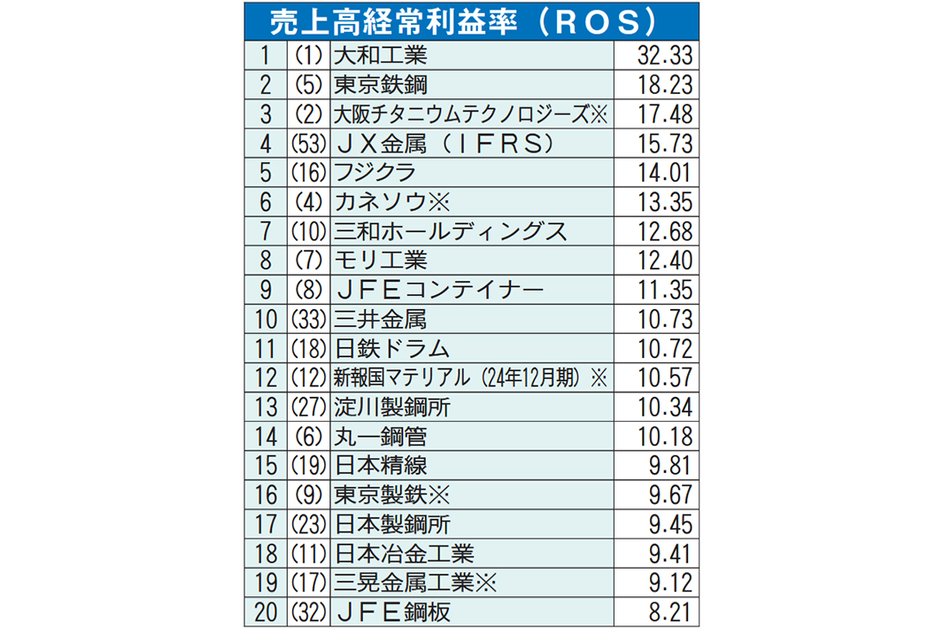 大和工業、ROS首位維持 経常益トップは日本製鉄 24年度業績ランキング