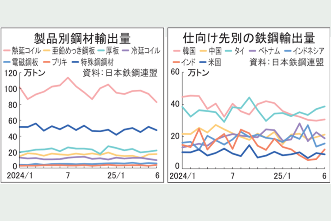 鉄鋼輸出が減り続けている。中国の大量で価格が軟化し続ける鋼材輸出が広く影響し、輸出先が狭められている。ASEAN向けは増加傾向に転じたが水準は低く、主要輸出先の韓国や中国向けは両市場の景気低迷を受けて減少している。米国の関税政策の影響による国際貿易の変化や需給の緩和で輸出環境は厳しさを増す見通し。中国の過剰供給が常態化し、国際経済の不透明感が強まる中、2025年度の鉄鋼輸出は5年連続減り、新型コロナ禍によって急減した20年度を下回る可能性がある。