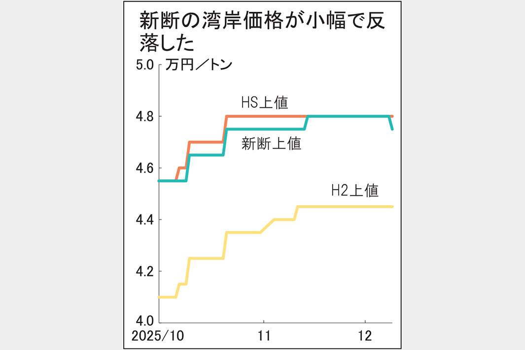 関東湾岸部の商社や輸出業者による新断スクラップの購入価格(湾岸価格)が、9日に小幅で反落し、4万6500―4万7500円前後と前日から500円下がった。下落は5月下旬以来約7カ月ぶり。ベトナムやバングラデシュ向けの輸出商談の難航を映した。両国の鉄鋼需要が盛り上がりを欠いていることなどが背景にあるもよう。
