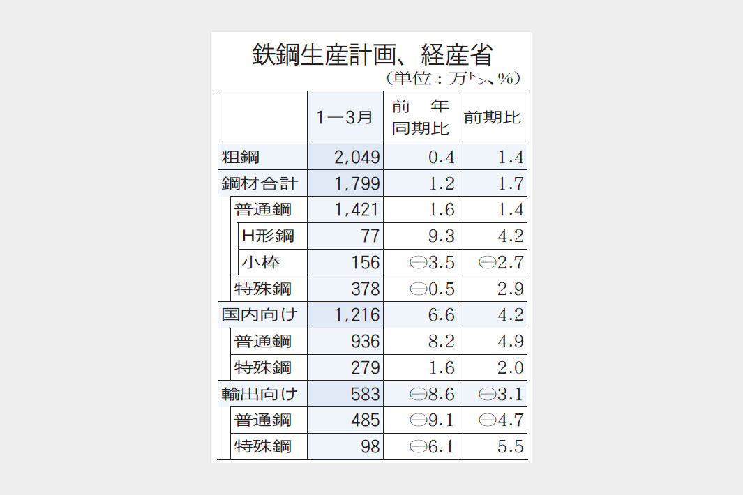 経済産業省が12日まとめた2025年度第4四半期(26年1―3月)の鉄鋼生産計画によると、粗鋼生産は前期比1・4%増の2049万トンと2四半期連続で増える。鋼材生産は輸出向けが減るが、国内向けの増加分が上回る。前年同期比でも輸出減を国内向けの増加が上回り、全体は増える。