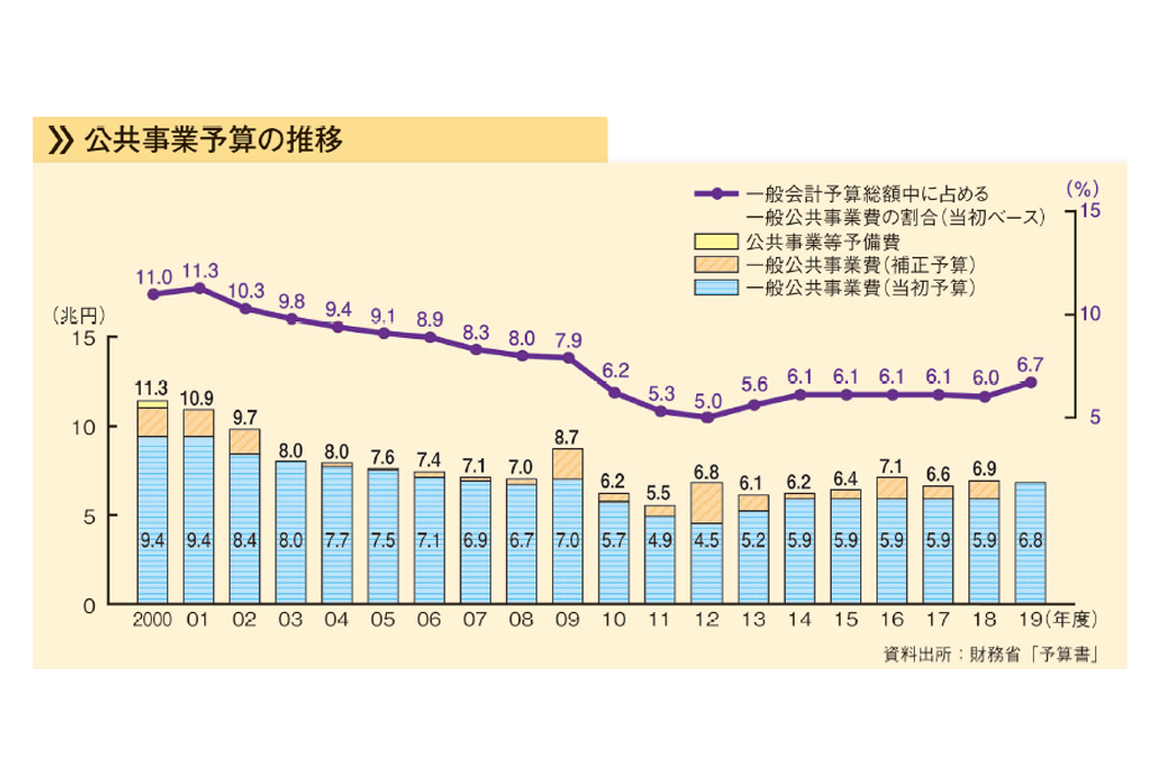 公共事業予算はピークだった1998年度の15兆円を境に右肩下がりで推移し、旧民主党政権時代に5兆円台まで下がったが、ここ数年は年間6兆―7兆円レベルで推移している。国が「防災・減災、国土強靭化のための3カ年緊急対策」(18―20年度)を策定したことも背景にあり、21年度以降も国土強靭化対策を継続する方針で、当面土木関係予算は底堅く推移する見通し。