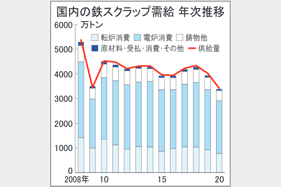 20年国内鉄スクラップ 需給とも3500万トン割れ リーマン以来の低水準