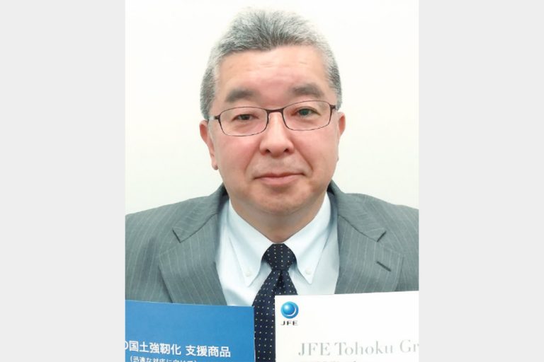 「復旧・復興では当社をはじめJFEグループが一丸となって取り組んできた。震災後いち早く東日本大震災復興協力班を立ち上げ『復興案件最優先』で対応した。例えばインフラの復旧・強化では、貢献できるJFEグループ商品や問い合わせ先を網羅したパンフレットを作成し、ユーザーが一刻も早く必要な製品を入手できる体制を築いた。これによって護岸、防潮堤、橋梁、道路、水門など多岐にわたるグループの技術や製品をタイムリーに提供することができた。また被災地への鋼矢板や鋼管杭の納入にあたっては、物流部門の協力を得ながら新たな物流基地の確保や道なき道のルート開拓に奔走した」
