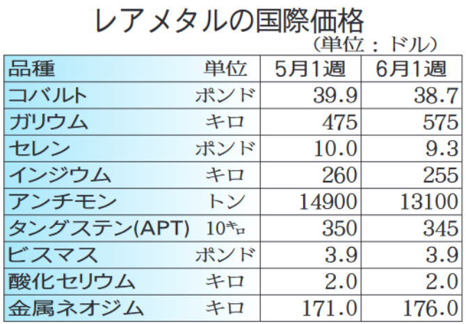 レアメタル国際相場/上海封鎖で相場反落/ガリウムは唯一続騰/金属ネオジム小反発