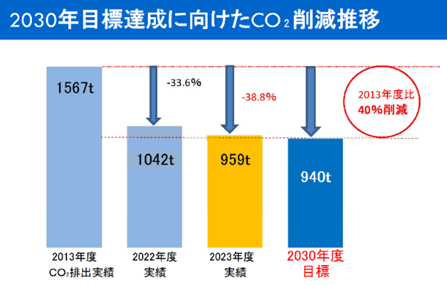 カーボンニュートラル対応では、2030年までに排出するCO2で13年度比30%削減する計画を策定。22年度に33・6%と大幅に前倒しで削減できた為、目標を40%削減に上方修正し、23年度は38・8%の削減を実現している。