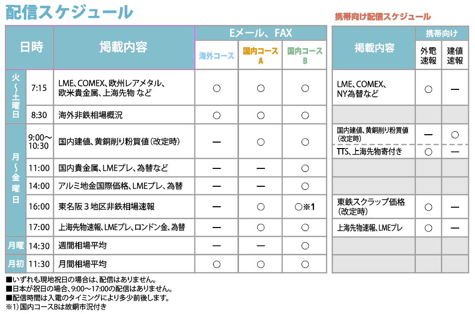 | 配 信 内 容 | LME、COMEX相場 | ○ | ○ | ○ | |