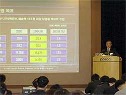 ソウルに続き、ニューヨークで26日に開催したCEOフォーラムでは「過去10年は財務内容の改善、配当性向の向上を優先してきたが、これからは積極投資による成長戦略を具体化することで『量的拡大と品質の高度化』を果たし、世界最高の鉄鋼企業の地位をめざす」と述べ、攻めの経営に転じる考えを明らかにした。99―03年の5年間の投資実績は7兆5000億ウォン。新中期計画では5年間13兆5000億ウォン(約1兆3500億円)の投資枠を設定。04年は前年の2・2倍に相当する2兆8000億ウォン(2800億円)を計画、このうち2兆3000億ウォン(2300億円)を国内製鉄事業に投じる考えだ。