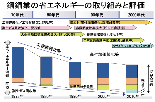 90年頃にはこれらの装備率がほぼ100%に達し、第一次石油危機時点に比べ20%を超える省エネを実現。さらに近年では廃プラスチック、廃タイヤのリサイクルなど、社会システムとリンクした新たな有効利用を進めてる。一方、業界の外に対しても製品・副産物による他産業や社会への貢献、国際技術協力による他国の省エネ化、製鉄所の緑化への取り組みなどで一定の成果をあげている。