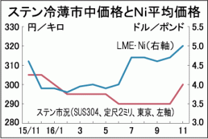 16年11月21日関東地区のNi系ステンレス全面高 冷薄、1年ぶり30万円台