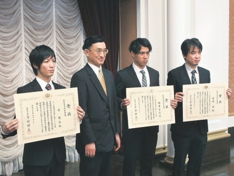 表彰伝達式・大阪製鉄・西日本熊本工場1504C 西日本熊本工場の3氏が受賞した「タンディッシュ耐火物のコスト改善」では、耐火物の材質変更やタンディッシュノズルの再使用などにより、大幅なコスト削減を達成。堺工場で受賞した3氏は「ビレット連続鋳造設備の機械トラブル改善」に取り組み、連鋳工程でのトラブル解消などを実現した。