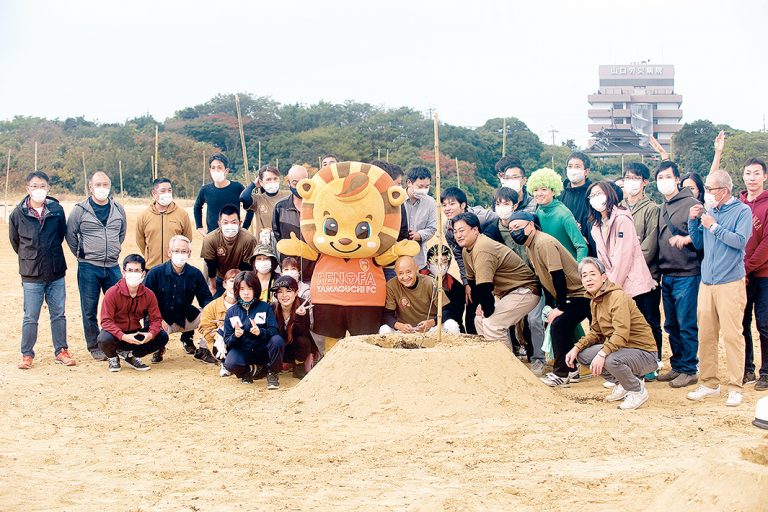 当日はサッカーJ2レノファ山口FCのマスコットキャラクター「レノ丸」君が登場。SDGsに興味があるというレノ丸君は、かわいらしい動きで植樹のお手伝いや参加者との記念撮影などに大活躍だったという。